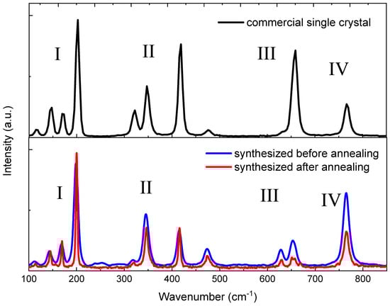 In order to study the effect of annealing on the valence states of Ga sublattice, we measured the Raman scattering spectra which reflect the vibrations of valence bonds. These spectra recorded for the synthesized β-Ga2O3 ceramics (before and after annealing) and commercial crystals are shown in Figure 6 and Table 4. Eleven peaks were found for all samples, which are consistent with the data in the literature [41,54,55,56,57] (see Figure 6). As a rule, the low-frequency zone (I) is attributed to the vibration and translation of tetrahedral-octahedral chains, the mid-frequency zone (II) reflects deformations of the GaO6 octahedron, and the high-frequency zones (III) and (IV) refer to stretching and bending of the GaO4 tetrahedron [57,58]. Some notable conclusions can be drawn by comparing the spectra before and after annealing. Considering that the spectra in lower Figure 7 are normalized at a frequency of 200 cm−1, we can conclude that, firstly, after annealing the contribution of peaks three and four drops significantly, and secondly, the peak at 655–660 cm−1 shows a doublet structure. Understanding this behavior, although it indicates a structural transformation of the synthesized ceramics, nevertheless requires a more detailed ab initio analysis of the Raman spectra with structural defects (vacancies, pairs of vacancies, etc.), which requires additional dedicated work. Recently, similar work was conducted, for example, for SrTiO3 crystal with oxygen vacancies [59,60].
