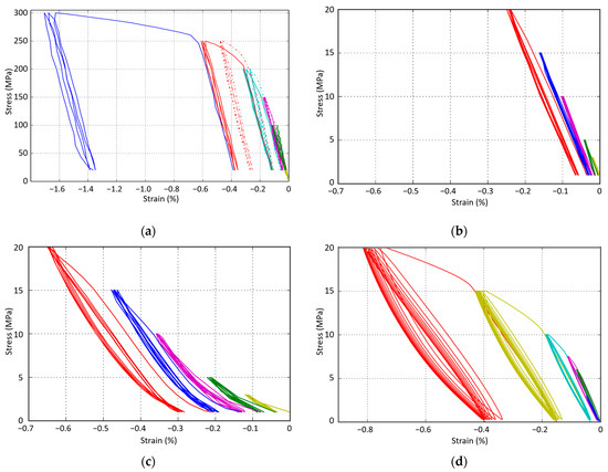Stress–strain results for progressive, cyclic (5 cycles/load, 1 colour per load) compression tests: (a) MM (full) and MMCs (dotted lines); (b) MMCsG1; (c) MMCsG2; (d) RM materials.