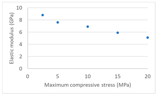 The compression test (Figure 9) on this bottom area is quite consistent with what was observed before the braking test: the elastic modulus measured for the 20 MPa maximum load series is about 4 GPa, corresponding to a damaged RM material.
