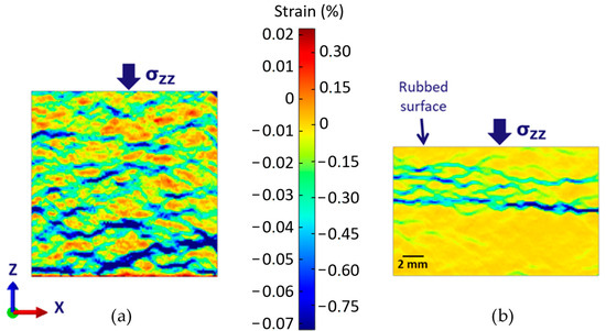DIC analysis of the RM pad, compressed at 20 MPa maximum load, (a) before and (b) after the braking test.