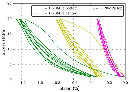 Stress–strain compression tests for five 1–20 MPa cycles applied on different layers of the worn pad: (green) intermediate (2–15 mm depth) region; (gold) bottom region; (pink) top layer (first 2 mm).