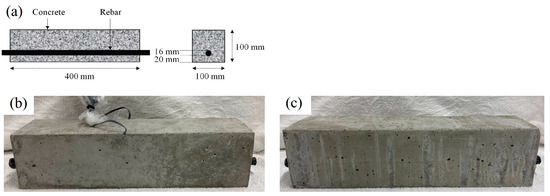 In this study, 16 small-scale reinforced concrete beams with identical dimensions (100 × 100 × 400 mm3) were used. They were all fitted with a single deformed tension rebar with a diameter of 16 mm, located 20 mm from the bottom surface, as shown in Figure 1a. One specimen from each set included two strain gauges fixed at mid-span on the tension rebar (Figure 1b,c). To examine the mechanical properties of the concrete at 28 days and on the bending test day, six standard cylinders of plain concrete 100 mm in diameter and 200 mm high were made when constructing the beams. All specimens were prepared and cured under the same conditions. The mix proportions of the concrete are presented in Table 1. After casting the concrete, the RC specimens were moisture-cured under a shower using tap water for 28 days. Following this curing period, they were dried for seven days at room temperature and were then immersed in salt water with a 3% chloride concentration for seven days. This process promoted the penetration of chloride ions inside the specimens. Prior to the immersion in salt water, both ends of the RC beams were coated with epoxy resin to exclusively allow chloride ingress via the lateral sides in order to simulate salt attack in a real-world setting.