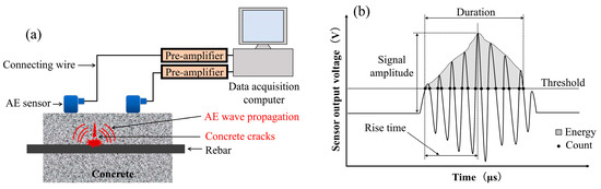 AE techniques are considered one of the non-destructive testing (NDT) methods. It has demonstrated its usefulness in assessing the damage to RC caused by the corrosion process and in determining the level of corrosion-induced damage. Chloride attack is one of the major causes of rebar corrosion in reinforced concrete. In salty environments, the rate of deterioration increases rapidly when chloride-induced corrosion occurs in reinforcing bars, which can have a serious impact on their overall performance. In many studies, AE parameters such as AE hits and energy are used to characterize the corrosion process in steel reinforcement members [1,2,3,4,5,6,7]. The AE sources are classified according to average frequency (AF) and RA value, which are both used to distinguish the failure types. Furthermore, the AE technique enables the location of the steel corrosion damage to be identified, as well as facilitating the detection of concrete cracking [8,9,10].