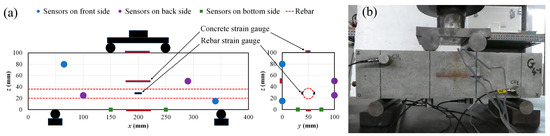 After performing electrically induced corrosion, the corroded and non-corroded specimens were subjected to four-point bending load testing up to failure. The flexural load test was carried out on three specimens from each set using a universal testing machine. Each specimen was supported at both ends. Furthermore, AE data and rebar and concrete strain data were acquired and recorded using one specimen prepared from each set. Six AE sensors of 150 kHz of resonance were mounted on the data acquisition specimens via the use of wax as a coupling agent. They were mounted two-by-two on three lateral surfaces of the specimens to enable a three-dimensional AE source location. Figure 4a provides the details on the distances between the supports and the loading points, and the coordinates of the AE sensors are listed in Table 2. Each sensor was connected to a preamplifier, which was connected to the acquisition computer. The AE sensors, the preamplifiers and the acquisition system are manufactured by MISTRAS Group, Princeton Junction, NJ, USA. The type of the sensors are (R15α) and the category of the preamplifiers is 2/4/6—Switch Selectable Gain Single-Ended and Differential. These voltage preamplifiers are fitted with switch-selectable gain ranges of 20, 40, and 60 decibels. As for the acquisition system, the AEwin version 2014 was used. Concerning event counting, the dead time was set to 2 ms, and the threshold level was set to 40 dB gain. The loading was single and monotonic, and the speed was set to 0.2 kN/s. The bending process is presented in Figure 4b.