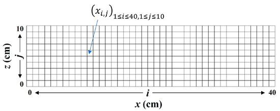 - Failure stages classification and AE sources’ location: The moving average of the maximum AE amplitudes, generated during bending testing, was explored to identify the different failure stages with time history. Therefore, a range of 50 was used to set the moving average of the maximum amplitude of AE events. Furthermore, to evaluate the concentration of AE sources generated during the bending process, a three-dimensional representation was adopted. Therefore, square cells with the dimensions of 10 mm × 10 mm were designed on the specimens’ sides surface via the x, y, and z axis. In each case, the maximum value of the concentration of AE sources in a cell via the front side of the specimen were determined, where i and j are, respectively, the position of a cell in the x axis from 1 to 40, and in the z axis from 1 to 10 (Figure 5). Then, the minimum of those four maxima , presented in Table 4, were considered to define four categories of AE sources concentration in a three-dimensional representation (Equations (6)–(9)).where n is the concentration of AE sources in a cell in a three-dimensional representation.