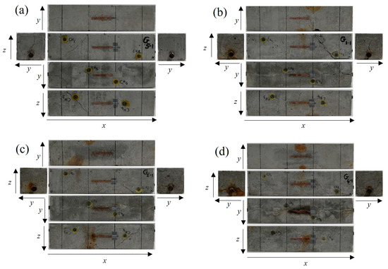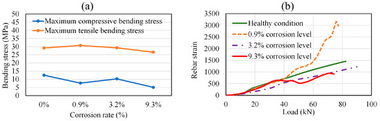 In Figure 6a–d, the failure profiles of the RC beams at the end of bending tests are presented for the healthy condition and the corroded cases. As all the specimens have a rectangular parallelepiped shape, the six faces of each specimen are presented for the visual observation of the damages resulting from the bending process. Therefore, the bending damage on different sides of the specimens can be observed. The extent of cracks observed in Figure 6a–d are further used in the representation of the crack’s location in Section 4.5, in correlation with preexisting corrosion-induced cracks. Figure 7a reveals that the compressive stress and tensile stress performance during bending testing tended to decrease with an increase in the degree of rebar corrosion inside the specimens. Many researchers have reported that bond strength between rebar and concrete in RC structures increases at a low level of corrosion. This phenomenon is attributable to an increase in rebar roughness and its confinement by concrete. However, a severe level of corrosion causes a sharp reduction in bond strength due to rebar slippage [34,35,36]. Therefore, the rebar strain tended to increase at the 0.9% corrosion level, regarded as a low degree of corrosion, then subsequently decreased as the corrosion level increased. At the 9.3% corrosion level, regarded as a severe degree of corrosion, the nonlinear irregular fluctuation of rebar strain was attributable to its intermittent slippage via the concrete. This was due to the formation of rust around the rebar, which caused the bond strength between the rebar and concrete to weaken (Figure 7b).