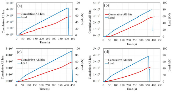Cumulative AE hits and load during bending test: (a) healthy condition; (b) 0.9% corrosion level; (c) 3.2% corrosion level; (d) 9.3% corrosion level.