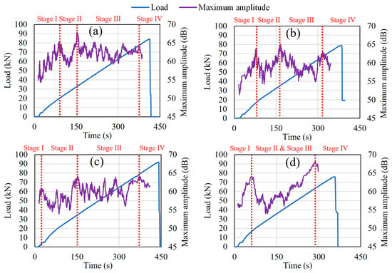 Figure 9a–d presents the moving average of the maximum AE amplitude generated with load versus time during bending testing for each case (healthy condition, 0.9%, 3.2%, and 9.3% corrosion rate cases). A range of 50 was used to set the moving average of the maximum amplitude of AE events. The pattern of the development of the fracture process could be classified in terms of microcracks and macrocracks in the concrete structure during the bending process. Therefore, four stages of damage in the fracture process were identified in correlation with the fluctuation in the maximum amplitude of AE hits. From the beginning of loading, the fluctuation in the maximum amplitude showed a tendency to increase up to the first peak, defined as stage I, during which nucleation of cracks occurred. Then, there was a decreasing trend in maximum amplitudes followed by an increasing trend up to the second peak, defined as stage II. During the second stage, macrocracks began to form and grow from the bottom area of the specimens between the two lower supports toward the upper areas due to the deformation process. Moreover, while the load increased, no new cracks appeared in the specimens. Stage III, during which the macrocracks opened, corresponded to the fluctuation of the maximum amplitudes from the limit of stage II up to the last peak. Finally, stage IV corresponded to the last decreasing trend in the maximum amplitudes, at which point failure occurred. In addition, from the healthy condition up to the 3.2% corrosion level, there was still a time lapse between the formation of macrocracks and their opening period, which made stages II and III distinguishable. However, those stages merged at the 9.3% corrosion level because they occurred simultaneously (Figure 9d). These findings regarding severe corrosion conditions are supported by the results of Zheng et al. [18], even using bigger scale RC beams fitted with multiple bars and with three damage stages determined during bending tests. They also found that the damage to the uncorroded and lightly corroded beams occurred mainly in the final stage, while the damage to the severely corroded beam occurred earlier, prior to the final stage.