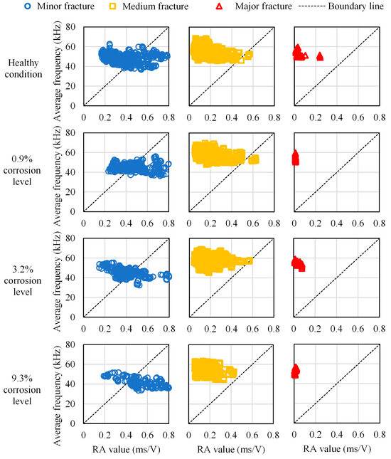 As illustrated in Figure 10, crack types can be classified based on the relationship between the RA value and the AF, according to the JCMS-IIIB5706 code. A tensile-type crack is referred to as an AE signal with high AF and low RA value. At the same time, a shear-type crack is designated by a low AF value and high RA value. These criteria are used to classify AE data recorded during the bending process. Based on these three fracture scale intervals defined in Section 3.3.3, a cross-analysis with the RA values and the average frequencies provided another classification, including damage scales and cracks mode, which are presented in tensile-type and shear-type. Although there is not yet a standard method for fixing the boundary line in the classification of RA values and average frequencies to identify tensile-type and shear-type damages, that classification made possible a comparative analysis of the fracture modes between the healthy condition and the different corroded cases. Therefore, the results from the relationship between RA-values and average frequencies show that the higher the corrosion level is, the more medium fractures migrate from predominantly the tensile type to the shear type, while the rate of medium fractures fluctuates inversely until being generated exclusively by the tensile type. Moreover, major fractures follow the same fluctuation as medium fractures Figure 11.