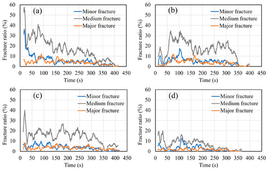 Progressive ratio of generated AE sources during the bending process with time history. (a) Healthy condition; (b) 0.9% corrosion level; (c) 3.2% corrosion level; (d) 9.3% corrosion level.