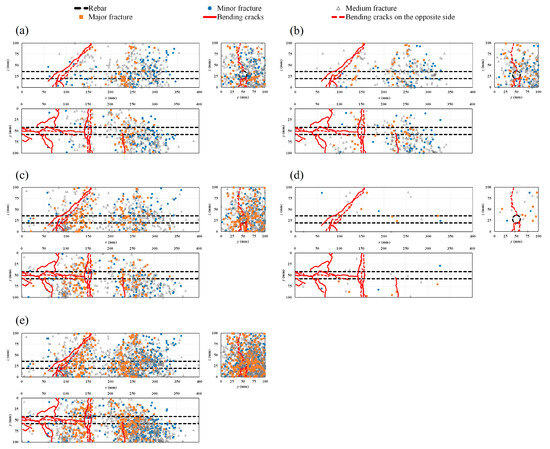 Location of AE sources and crack patterns in the healthy condition: (a) stage I; (b) stage II; (c) stage III; (d) stage IV; (e) all stages combined.