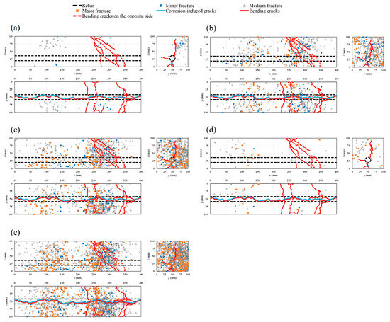 Location of AE sources and crack patterns for 0.9% corrosion level: (a) stage I; (b) stage II; (c) stage III; (d) stage IV; (e) all stages combined.