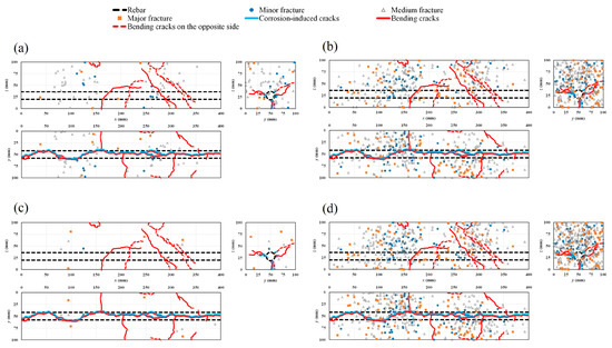 Location of AE sources and crack patterns for 9.3% corrosion level: (a) stage I; (b) stages II and III; (c) stage IV; (d) all stages combined.