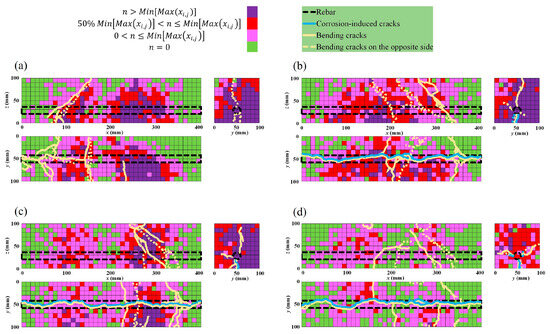 Furthermore, to evaluate the concentration of AE sources generated during the bending process, a three-dimensional representation was adopted, as presented in Section 3.3.3. The results presented in Table 4 reveal that the maximum concentration of AE sources generated in a cell decreases with the increase in corrosion level. The correlation between the bending cracks and corrosion-induced cracks is illustrated in Figure 17a–d for the four cases. Preexisting rebar damage due to corrosion trends lowers the concentration of AE during the bending failure. In the healthy condition and the low corrosion level of 0.9% (Figure 17a,b), more cells with higher AE source concentration are located in the tension area around the rebar location, where bending cracks were initiated. From the 3.2% to the 9.3% corrosion level, cells with higher AE source concentration migrate progressively toward the compression area at the upper zone of the specimens. That phenomenon describes the impact of preexisting corrosion-induced damages on the bearing capacity of the beams.