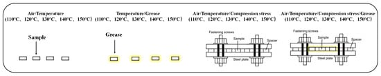 Finally, based on the above preliminary analysis and work preparation, we designed an accelerated aging test scheme plan for silicone rubber as shown in Figure 3. To ensure the reliability of test results, four parallel specimens were set under each aging condition and accelerated stress level, and the samples were examined after 2, 5, 8, 15, 27, 40, and 54 days, respectively. All samples will be cleaned with distilled water to remove residual oil from the surface in preparation for subsequent testing.