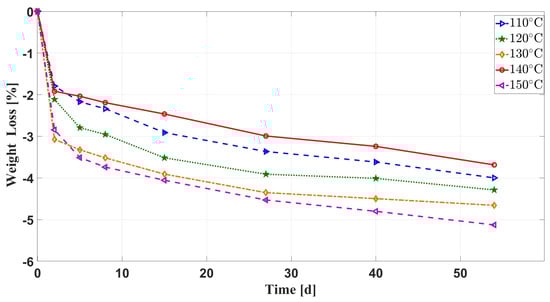 Figure 4 demonstrates the variation of the weight loss rate of silicone rubber with aging time at different aging temperatures under the effects of multiple environmental factors. It can be seen that the curves have roughly the same trend and are all negative, which indicates that the weight of the specimen is increased during the aging process under the action of multiple factors, such as air, compressive stress, oil, and temperature. The weight of the silicone rubber specimen increases rapidly during the pre-aging period (0–2 days), and the rate of its weight increase slows down after 2 days. When the aging temperature is 110–130 C, the weight increases with the increase in temperature. At 140 C, the weight of the silicone rubber specimen increases the least and at 150 C, the weight increases the most.