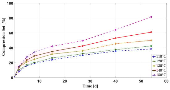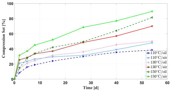 Comparison of compression set of samples with aging time under multiple environmental factors.