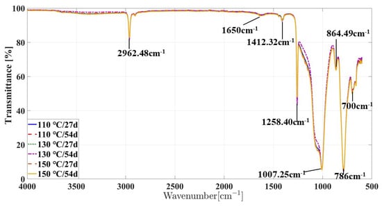 In this section, the ATR-FITR was performed on the aged specimens of silicone rubber via multiple environment factors with aging temperatures of 110 C, 130 C, 150 C and aging times of 27 days and 54 days, respectively, as shown in Figure 7.