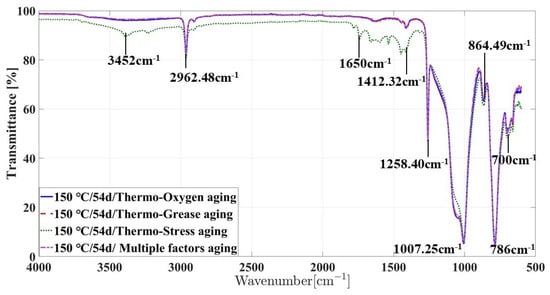 The infrared spectra of silicone rubber samples under different aging conditions were compared and analyzed, as shown in Figure 8. It was found that under the same aging temperature and aging time, the infrared spectra of silicone rubber samples with hot oxygen aging, hot oil aging, and multi-factor coupling aging were roughly the same, and there was no obvious difference. There are new absorption peaks near the wave number 1650 cm, which indicates that there is the formation of the oxidation product C=O functional group during the aging process. Under the condition of thermal stress, not only does the absorption peak representing the functional group of oxidation product C=O appear but also the absorption peak representing hydroxyl (-OH) appears, and the corresponding absorption peak intensity of the two oxidation products is the largest in all aging conditions.