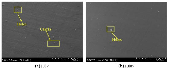 In this section, SEM was fully utilized to observe the micromorphology of silicone rubber samples before and after aging. Figure 10 shows the morphology of the surface of the silicone rubber aged specimen in contact with the compression device. After an aging temperature of 150 C and aging for 54 days, there are obvious cracks on the surface under low magnification, and holes can be seen under high magnification. While Figure 11 demonstrates the morphology of the surface of the aged silicone rubber specimen in contact with the air under the same conditions, it can be seen under low magnification that there are obvious cracks on the surface, and under high magnification, it can be seen that there is the emergence of holes and cracks, and both of them are deeper than the surface that is in contact with the compression device in the above figure.