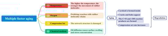 Despite its excellent properties, such as natural corrosion resistance and resistance to aging, it is undeniable that in the face of the increasingly severe and complex service environments of modern equipment, the long-term exposure to harsh environmental conditions can accelerate the degradation and failure of silicone rubber. To address this issue and enhance its environmental adaptability, durability, and reliability, many experts and scholars both domestically and internationally have conducted pioneering research. In their work, Kaneko et al. [17] conducted a comprehensive study on the degradation mechanisms of silicone rubber under various ultraviolet spectra, laying the groundwork for subsequent research on its ultraviolet aging. Additionally, Liu et al. analyzed the temperature distribution patterns under temperature and pressure loads, which explained the failure of silicone rubber seal structures on barrel hangers in high-pressure and extreme temperature environments, uncovering the reasons for early rubber failure [18]. Considering the aging process of silicone rubber in harsh environments, such as high altitudes and strong salt spray, Zhang et al. conducted a detailed study using ATR-FTIR (Attenuated total reflection-Fourier transform infrared) spectroscopy [19]. Their findings indicated that silicone rubber underwent a degree of degradation, with the main polymer chains breaking, and a reduction in polymerization. Furthermore, there have been numerous notable results in understanding the aging mechanisms of silicone rubber in various other harsh environments [20,21,22].