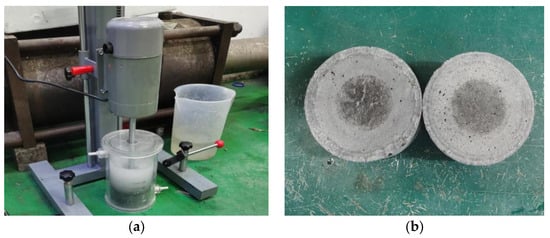 The abrasion resistance was tested using the underwater steel ball method defined in Chinese Standard DL/T 5150-2017 [33]. The test equipment is shown in Figure 3a. The abrasion time was 72 h at a rotation speed of 2400 r/min. The sample size was Φ100 mm × 50 mm, with its appearance after the test given in Figure 3b. Three tests per series were conducted at 28 d age. The abrasion resistance of UHPC was calculated using Equation (4).