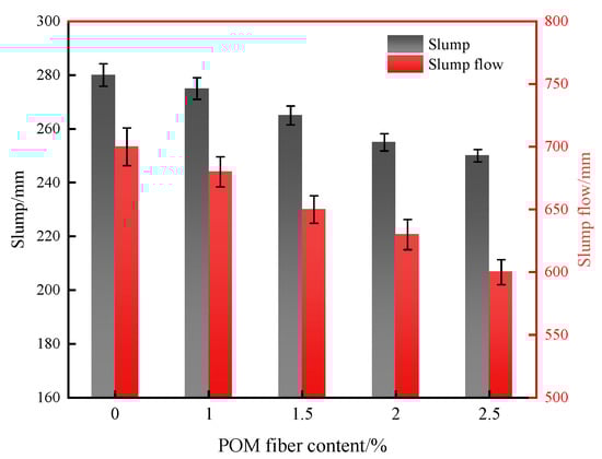 Since UHPC contains a high number of cementitious materials and a low water-to-binder ratio, all the fresh UHPC with different amounts of POM fiber in this work has good cohesion and water retention capacity. Figure 4 shows the slump and slump extension of UHPC with different contents of POM fiber incorporation. The optimal workability of UHPC without POM fiber addition was 280 mm of slump and 700 mm of slump extension. With the increase in POM fiber from 0% to 2.5%, the slump of UHPC decreased by 10.7% and the slump extension decreased by 14.3%. The flowability of UHPC decreased with increasing volume of the POM fiber. The main reason for this phenomenon is that the increasing fibers enlarge the friction inside the paste, increasing the energy barrier for the fresh flow of UHPC [35]. Furthermore, an increased amount of fiber would strengthen the bridging phenomenon between the fibers, forming a 3D network structure and hindering the flow of the UHPC paste.