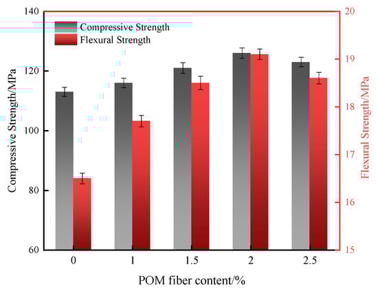The effect of POM fiber amount on the 28 d compressive and flexural strength of UHPC is shown in Figure 5. With the increase in POM fiber amount, both the compressive strength and flexural strength of UHPC show the tendency of an increment followed by a decrement. The compressive and flexural strengths of UHPC reach the maximum at a POM fiber content of 2.0%, with values of 126 MPa and 19.1 MPa, respectively. The reason is that the POM fibers have a high elastic modulus and tensile strength and disperse uniformly in the UHPC, which can restrain lateral deformations when the specimen is under compressive loading. The bridging effect of the fiber can inhibit the generation and growth of cracks in the UHPC and thus increase its flexural strength. However, when the fiber content is too high, the fibers would agglomerate and introduce defects such as air voids and microcracks in UHPC [36]. This would weaken the interfacial bond between the fiber and matrix, which offsets the reinforcing effect of the fibers and causes decreasing mechanical properties of UHPC. It should be noted that the enhancement in the flexural properties of UHPC through the addition of POM fibers is more significant than that of the compressive strength. This is mainly because of the smaller elastic modulus of POM fibers than the cement matrix, which leads to the enhancement in compressive properties not being noticeable. However, the network structure formed by POM fibers in the UHPC matrix can improve its flexural properties through bridging and the energy absorption of pulling out and breaking.
