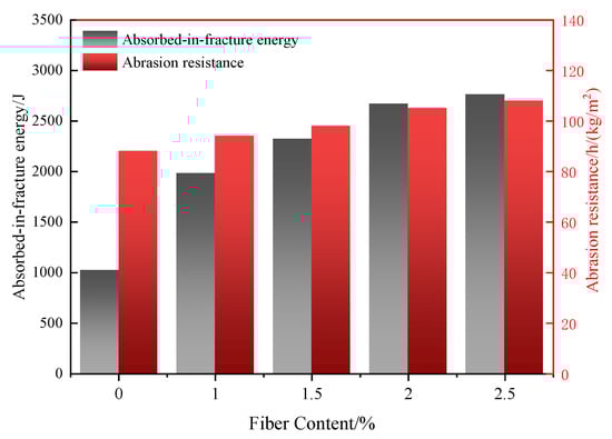 The impact and abrasion resistance of UHPC with different POM fiber contents are shown in Figure 6. It can be noticed that the impact and abrasion resistance of UHPC increases with the increase in POM fiber content. For the control sample, the absorbed-in-fracture energy and abrasion resistance of UHPC are 980 J and 88 h/(kg/m2), respectively. When the POM fiber content reaches 2.5%, the absorbed-in-fracture energy and abrasion resistance of UHPC are increased by 170.5% and 22.7%, which are 2760 J and 108 h/(kg/m2), respectively. The impact resistance is enhanced more than the abrasion resistance with POM fiber incorporation.