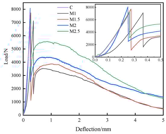 The load–deflection curves of UHPC with different POM fiber contents are given in Figure 7. It can be observed that the loading rapidly decreases after the peak value for the control sample, indicating the brittleness of the sample. The fracture behavior of UHPC with POM fibers exhibits a different fracture mode. Its loading–deflection curve also decreases abruptly after the peak, showing a secondary increase followed by a slow decrease. After that, the samples rupture. With increasing deflection, the UHPC continues to crack. After the peak loading, many cracks are already generated in the UHPC matrix. However, the POM fiber network in the UHPC slows its further damage. POM fiber can also consume external loading energy through fiber fracture and pull out, which increases the loading capacity of the specimen. Finally, the flexural toughness of the UHPC improves. It can be found that the peak loading of the UHPC gradually increases with an increasing amount of POM fiber from 1% to 2.5%. The secondary peak loading also becomes more prominent, and the area inside the curve increases gradually. This indicates that increasing POM fiber further enhances the flexural toughness of UHPC.