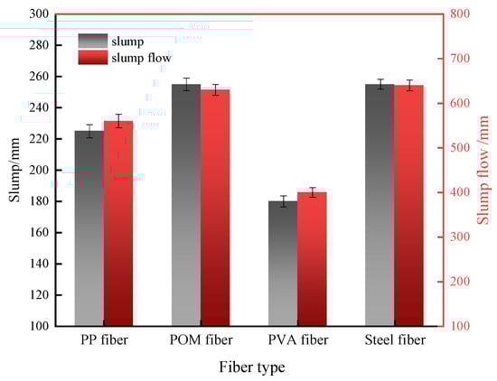 The workability of UHPC prepared with different fibers is shown in Figure 8. It can be noticed that the UHPC with PVA fibers has the worst workability, with a slump flow of only 400 mm. The UHPC with steel fibers has the best workability. It has a slump and slump flow of 255 mm and 640 mm, respectively. The UHPC with POM fibers has good workability comparable to the steel fiber UHPC. The workability of UHPC with PP fiber has a slump and slump extension of 225 mm and 590 mm, respectively, which can still meet the requirements for self-compacting concrete [38]. PVA fiber has the most significant specific surface and the largest water requirement. Hence, its addition seriously worsens the workability of UHPC. PP fiber shows hydrophobicity and is vulnerable to agglomeration in the mixture, which also decreases the flowability of the concrete [39]. Steel fiber and POM fiber can uniformly disperse in UHPC, thus not negatively affecting the UHPC workability.