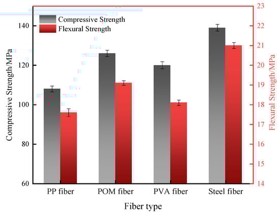 The effect of fiber type on the 28 d mechanical properties of UHPC is shown in Figure 9. It can be seen that the UHPC with steel fibers had the highest 28 d compressive and flexural strengths, which reached 139 MPa and 21.0 MPa, respectively. The mechanical strength of the UHPC with synthetic fibers was distinctly lower than that of the UHPC with steel fibers. Nevertheless, UHPC with POM fibers shows the best mechanical strength among the synthetic-fiber-reinforced UHPC. It has 28 d compressive and flexural strengths of 126 MPa and 19.1 MPa, which are 6.8% and 8.5% higher than those of the PP fiber-reinforced UHPC and 3.3% and 5.5% higher than those of the PVA-fiber-reinforced UHPC, respectively. As expected, steel fibers have the highest elastic modulus and tensile strength, which can effectively constrain the deformation of UHPC and enhance its mechanical strength. Among the synthetic fibers, POM fibers have a higher modulus of elasticity and tensile strength than the other two fibers. Therefore, UHPC prepared with POM fibers shows the second highest mechanical strength. The damage mode of UHPC with different fiber types is illustrated in Figure 10. It should be noticed that UHPC with PVA fibers directly exploded under compressive loading, indicating the weak constraint of PVA fibers on the concrete. UHPC added with PP fibers ruptured with one penetrating crack and several obvious surface cracks. Conversely, UHPC reinforced with steel and POM fibers did not have significant splitting cracks or splattering debris upon damage, demonstrating their excellent ability to toughen the concrete.