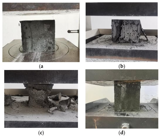 Effect of fibers on the failure mode of UHPC under compressive loading. (a) POM; (b) PP; (c) PVA; (d) SF.