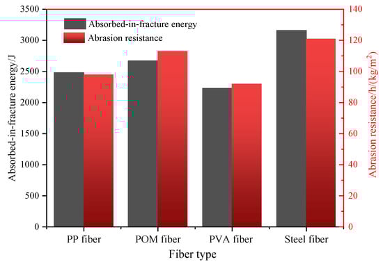 The effect of fiber type on the impact and abrasion resistance of UHPC is shown in Figure 11. It can be observed that UHPC prepared from steel fibers has the highest absorbed-in-fracture energy and abrasion resistance. The values are 105 h/(kg/m2) and 3160 J. Steel fiber has high stiffness and an interfacial solid bond with the cement matrix, which produces an obvious bond connection with cement paste. Therefore, steel fiber can absorb the largest energy under impact and abrasion. Compared with the UHPC with steel fibers, the absorbed-in-fracture energy of UHPC with POM, PP, and PVA fibers was reduced by 7.1%, 15.5%, and 14.2%, and the abrasion resistance was reduced by 21.5%, 15.9%, and 29.4%, respectively. POM fibers had the highest absorbed-in-fracture energy and abrasion strength among the synthetic fibers. PP fibers were the second highest. This is due to the low interfacial bond strength between PP fibers and cement matrix. PVA-fiber-strengthened UHPC shows the lowest impact and abrasion resistance, which may be derived from the low tensile strength of PVA fibers. POM fiber has a high elastic modulus, which can effectively bridge the cracks and prevent them from growing and propagating. POM fiber can also adsorb impact and abrasion energy through pull out and breakage.