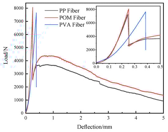 Steel-fiber-reinforced UHPC shows a higher flexural strength than synthetic fiber-reinforced UHPC, so flexural toughness studies were only performed on synthetic fibers. Figure 12 shows the load–deflection curves of UHPC with different synthetic fibers. It can be noticed that the load–deflection curve of the PVA specimen is directly interrupted after the sudden drop, indicating the breakage of the UHPC. Conversely, both the curves of PP and POM2 specimens show plateaus after the peak loading. This demonstrates that both PP and POM fibers can improve the flexural toughness of UHPC. Compared with the UHPC prepared by PP fibers, the load–deflection curve of UHPC with POM fibers has a higher peak loading and higher loading at the plateau areas.