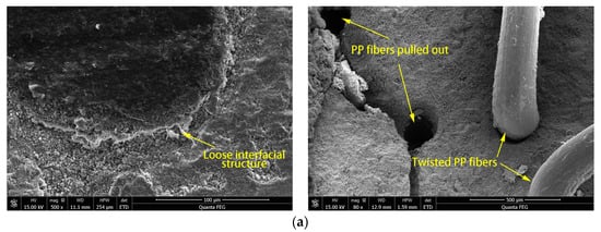 Figure 13 shows SEM images of the interface between different synthetic fibers and UHPC paste. It can be observed that the UHPC paste around the PP fibers is loose, and there are clusters of hydration products. The PP fiber at the fracture surface was twisted, but its structure was intact, and its surface was smooth. In addition, round holes on the fracture surface were presented, caused by the pulling out of the whole fiber. This indicates the weak bonding between PP fibers and UHPC paste. PP fiber reinforcement can only absorb the tensile loading through friction after debonding from the paste [41]. This part of energy absorption is finite, which leads to the weak bridging effect of PP fibers in the UHPC. The UHPC paste around POM and PVA fibers is dense, and there is no apparent interfacial transition zone, especially the PVA fiber attached to the hydration products, indicating that these fibers are well bonded with the UHPC paste. POM fiber in the fractured surface is distorted and torn apart along its axial direction. The fracture surface is more extensive along the axial direction than the direction perpendicular to the axis, indicating that POM fiber is firmly bonded with the paste. When UHPC is damaged, reinforced POM fibers can absorb energy through debonding, fracture, and tearing, which effectively bridge the cracks in the UHPC paste. The bond between the PVA fiber and the paste is also firm. However, due to the low tensile strength of PVA fiber, most of the fibers are simultaneously broken upon UHPC fracture. Therefore, the toughening effect of PVA fiber on UHPC is not obvious.