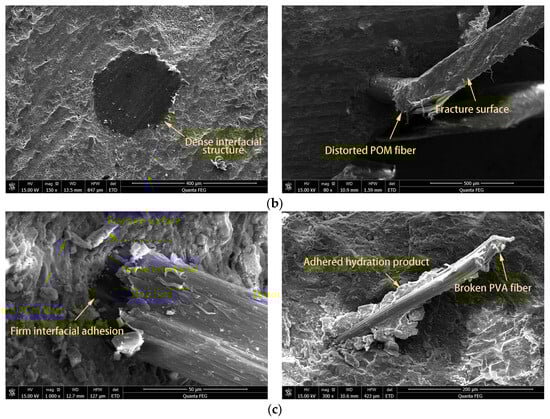 SEM images of interfaces between fibers and UHPC paste. (a) PP fiber; (b) POM fiber; (c) PVA fiber.