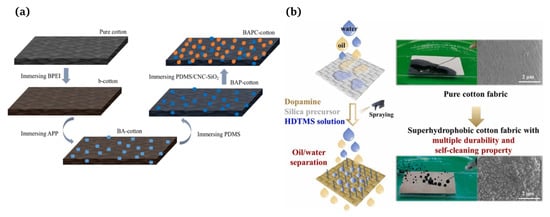 (a) Formation mechanism of the flame retardant and superhydrophobic cotton fabric [111]; (b) superhydrophobic cotton fabric with improved durability and wearer comfort using spray methods [8].