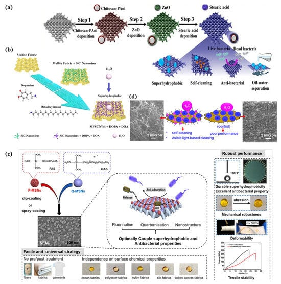(a) Application of self-cleaning, superhydrophobic, and antimicrobial cotton fabrics [115]; (b) silicon carbide nanowire modified mullite fabric hierarchical structure applied as a stable and self-cleaning superhydrophobic material [116]; (c) textile coatings with antifouling and antibactericidal properties for medical and daily protection situations [117]; (d) employment of self-cleaning cotton fabrics and antifungal/antimicrobial surfaces [118].