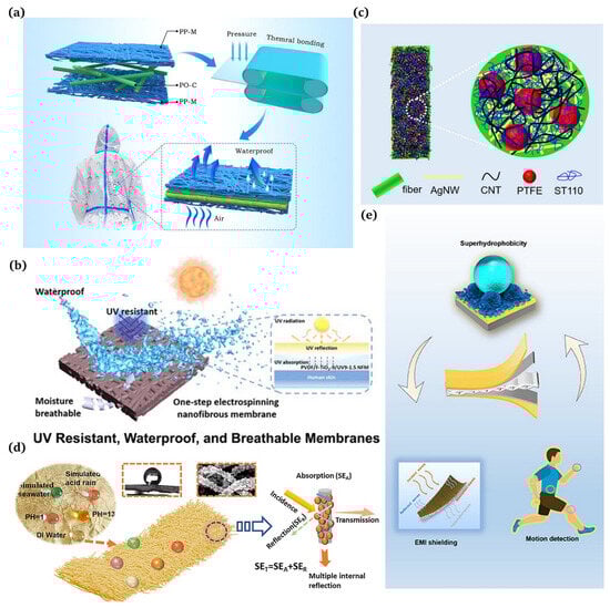 (a) Applications of three-layer laminated polyolefin microfiber fabrics [120]; (b) wearable smart membranes as a functional core layer in fabrics [121]; (c) silver nanowire (AgNW) networks and superhydrophobic coatings for commercial textile products [122]; (d) employment of superhydrophobic and corrosion resistant electrospinning hybrid membranes for efficient electromagnetic interference shielding [123]; (e) superhydrophobic e-textiles with an Ag-EGaIn conductive layer for motion detection and EMI shielding [124].