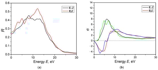 Figure 9 shows the reflection spectrum of the AgAlS2 crystal in phase II. As the figure illustrates, the average value of the reflection coefficient is approximately 0.4. As the energy increases from 0 to 12 eV, the reflection coefficient increases, peaking at R = 0.53. As energies became larger than 12 eV, the reflection coefficient decreased monotonically. At low energy values, there is significant anisotropy in the reflection spectrum. Upon reaching the maximum value, total anisotropy reduces. Figure 9b,c also show the optical conductivity spectrum and loss function.