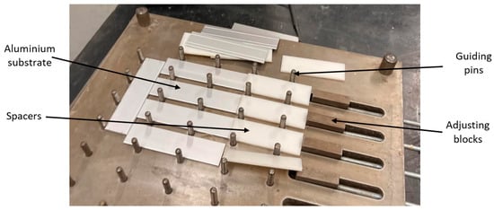 SLJs were mounted in a steel mould [49], previously cleaned and coated with release agent film (Figure 2). To control the specimen geometry, 3D-printed polymeric spacers were used, coated with release agent film to facilitate removal after adhesive curing. Since the aluminium substrates were anodised, the surface was simply degreased with isopropyl alcohol (IPA) before adhesive application. Figure 1 shows an image of the stage in which the aluminium substrate SLJs with 25 mm overlaps were prepared.