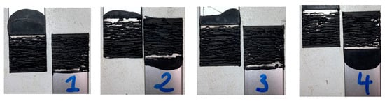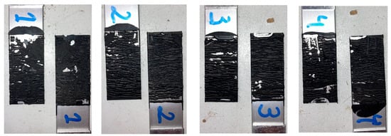 The SLJs were tested at a quasi-static constant crosshead rate of 1 mm/min at room temperature (RT) in an Instron 3832 (Norwood, MA, USA) quasi-static machine equipped with a 30 kN load cell. Figure 3 and Figure 4 display the modes of failure for both 25 and 50 mm overlap lengths, respectively.