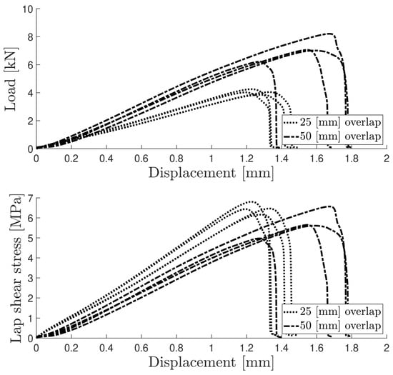 Cohesive failure occurred for all specimens with both overlap lengths. The failure did not originate as a single crack along the overlap edges but led instead to the cracking of multiple sites throughout the thickness. Thus, the two-component formulation showed good adhesion with the anodised aluminium substrates. Figure 5 shows the load–displacement or P–δ curves, as well as the lap shear stress evolution, for both overlap lengths. The lap shear stress values, when testing under different bonding areas, generally remained very close, as a result of the large flexibility of the adhesive.