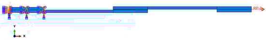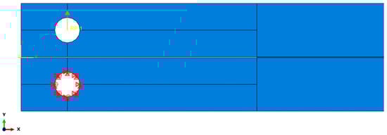 The lower hole of the DCB specimen was pinned, allowing for rotation along the normal axis to the surface, with an induced displacement along the y axis for the upper hole, as illustrated in Figure 8. Although a more dense and refined mesh over the total bonded area ought to provide a smoother P–δ curve, a single-bias mesh from the crack tip until the end of the specimen was found to provide similar results with less computational time.