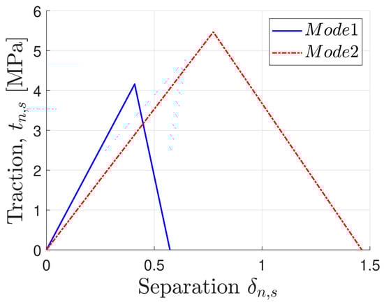 where the value for the α parameter chosen was equal to one, thus resulting in a linear relationship. The estimated values were interpolated to plot the triangular shape laws in Figure 9, used in the cohesive elements [40].