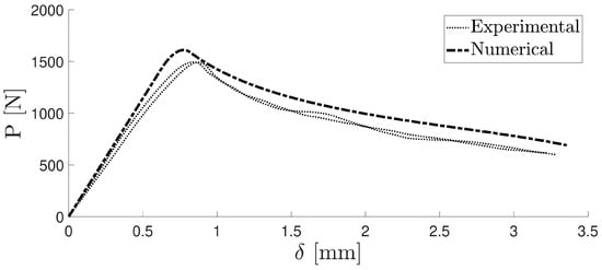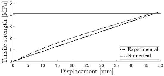 The tensile behaviour was assumed to follow a linear elastic behaviour, as the material tensile properties did not present a yield point followed by a plateau. Figure 10 illustrates the tensile strength–displacement curve for a typical experimental run with the numerical model.