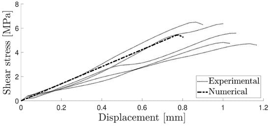 In the shear test, significant variations were observed in the experimental curves due to the low adhesive stiffness. A satisfactory correlation was found by employing the same triangular shape cohesive law, as shown in Figure 11.