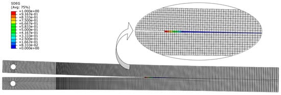Then, those specimens were tested after the precracking stage was completed. The previous study showed that the measurement of the critical energy release rate GIc does not depend on whether the specimen undergoes precracking. The results of the numerical study were compared with the experimental results for both the precracked and non-precracked specimens. Figure 12 illustrates the damage evolution value of the cohesive layer at a particular opening stage of the specimen, and Figure 13 displays the P–δ curve for the numerical simulation and the precracked specimens. The R curves obtained with the compliance beam-based method (CBBM) [45], for both numerical and experimental conditions, are displayed in Figure 14.