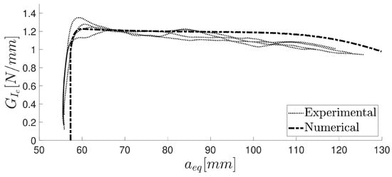 R curve computed using the CBBM for the numerical and experimental data modulus values calculated using the thick adherend shear test and another one obtained by extrapolating the value from the estimation of the Poisson’s ratio from the tensile test, using the outputs obtained with DIC software (2019). The higher shear modulus value provided a more accurate result over the bulk extrapolated value.
